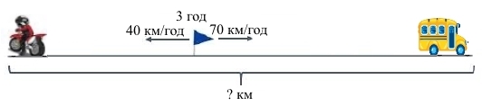 З одного пункту в протилежні сторони їхав мотоцикліст і автобус. Швидкість мотоцикліста 40 км/год, автобуса – 70 км/год. Яка відстань буде між ними через 3 години?
