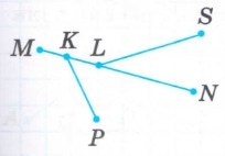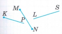 Завдання 1 На рисунку зображено відрізок MN, промінь КР і пряму LS. Запишіть, які з цих фігур перетинаються.