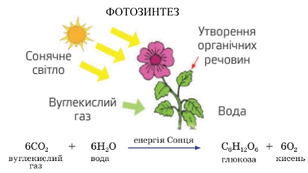 Фотосинтез — процес перетворення неорганічних речовин на органічні в результаті використання сонячної енергії з утворенням кисню. Цей процес відбувається в хлоропластах, які забарвлюють рослину в зелений колір.