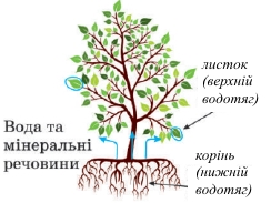 Листок є верхнім водотягом, а корінь — нижнім. Вони переміщують речовини у протилежних напрямках.