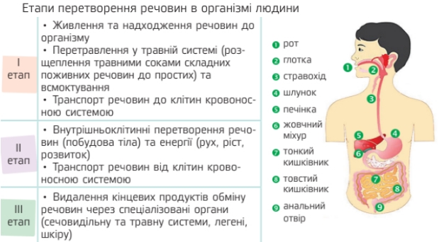 4. Перерахуйте етапи перетворення речовин в організмі людини.