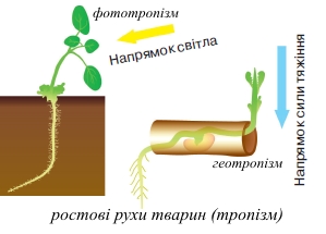 Тропізми — реакції орієнтування організму або клітини рослин на різні дії подразників зовнішнього середовища: світло, земне тяжіння, хімічні речовини тощо. Характерні всім рослинам. Ростові рухи, повертання листків до джерела світла.