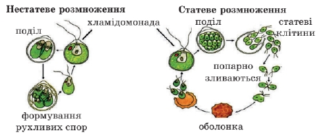 При сприятливих умовах (весна, літо) хламідомонада розмножується рухливими спорами (нестатево). При несприятливих умовах (осінь) розмножується статево, формуючи велику кількість статевих клітин, які попарно зливаються, вкриваються оболонкою і падають на дно водойми на час несприятливого періоду. Навесні нестатевий процес знову відновлюється і все повторюється.