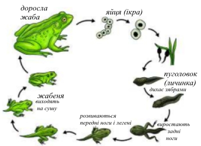 Її ікринки розпливлись у різні боки. Але одне таке яйце умостилося в затишному місці і перетворилося на личинку. Жаба назвала її пуголовок. Личинка росла, у неї появились задні ніжки. Жаба не могла натішитися перетвореннями. А потім появилися легені та передні ніжки. Це вже був не пуголовок, а маленьке жабеня.