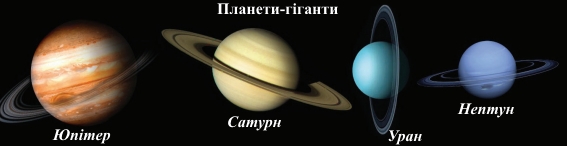 Планети земної групи – Меркурій, Венера, Земля, Марс. Планети-гіганти – Юпітер, Сатурн, Уран, Нептун.