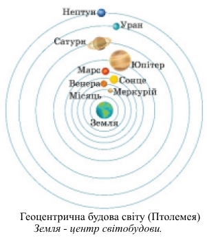 Це – геоцентрична система світу. За нею в центрі Всесвіту розміщується Земля, а навколо неї по колових орбітах обертаються планети, Сонце та Місяць.