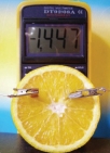 У фрукт вставляють два металеві стрижні, цинковий (+) і мідний (—), їх з’єднують провідниками. Фруктова кислота є середовищем, яке проводить струм. Лимонна «фруктова батарейка» дає струм напругою ≈ 0,9В.