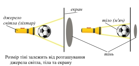 Розміри тіні залежать від взаємного розташування джерела світла, тіла та екрану.