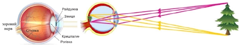 Око – орган зору, який збирає світлові промені. Світло потрапляє в око крізь зіницю. Зображення віддалених об'єктів утворюється на сітківці ока. Найпоширеніші вади зору далекозорість та короткозорість.