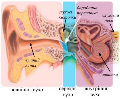 Вухо фокусує всі звуки. По вушному каналу звук досягає барабанної перетинки, яка коливається під впливом звуків. Завитка перетворює ці коливання в електричні імпульси, слуховий нерв передає їх у мозок. Мозок аналізує інформацію.