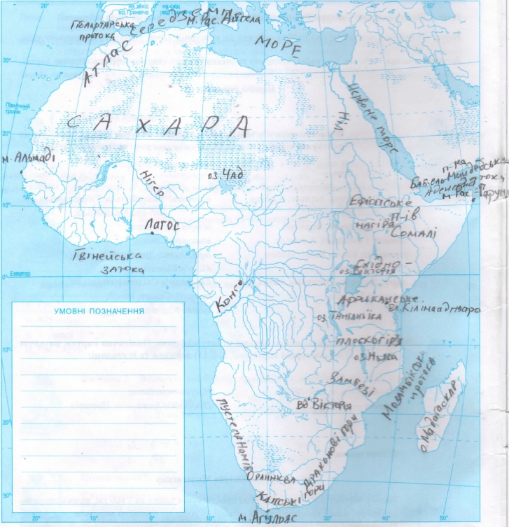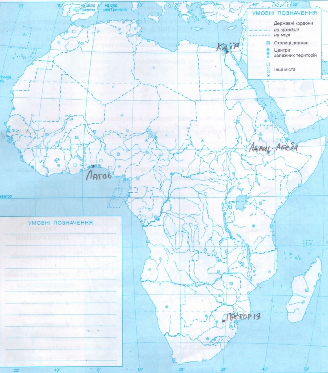 Позначення на контурній карті назв основних географічних об'єктів Африки