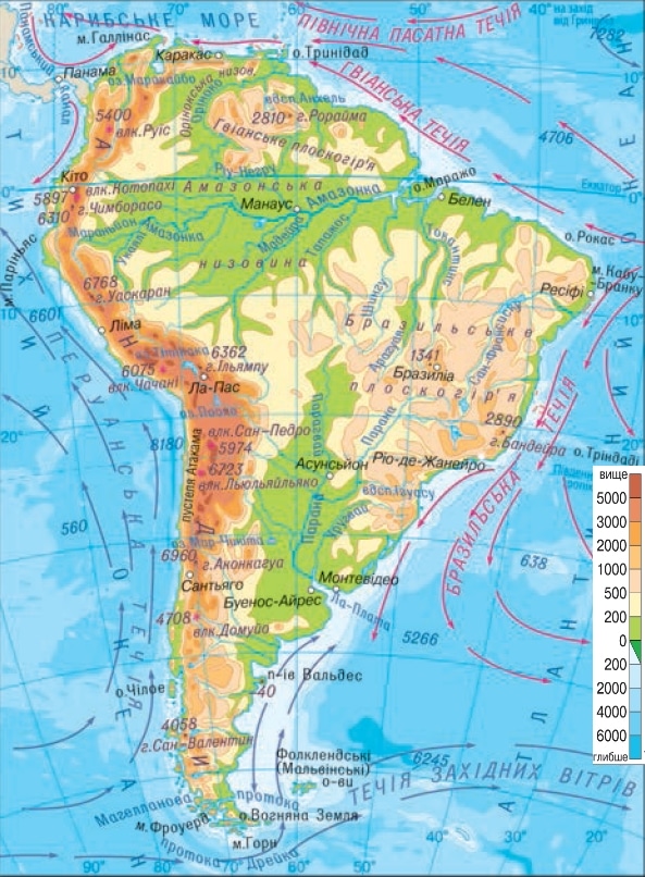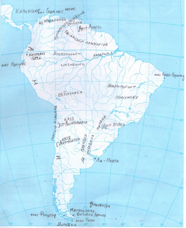 Позначення на контурній карті географічних об'єктів материка Південна Америка