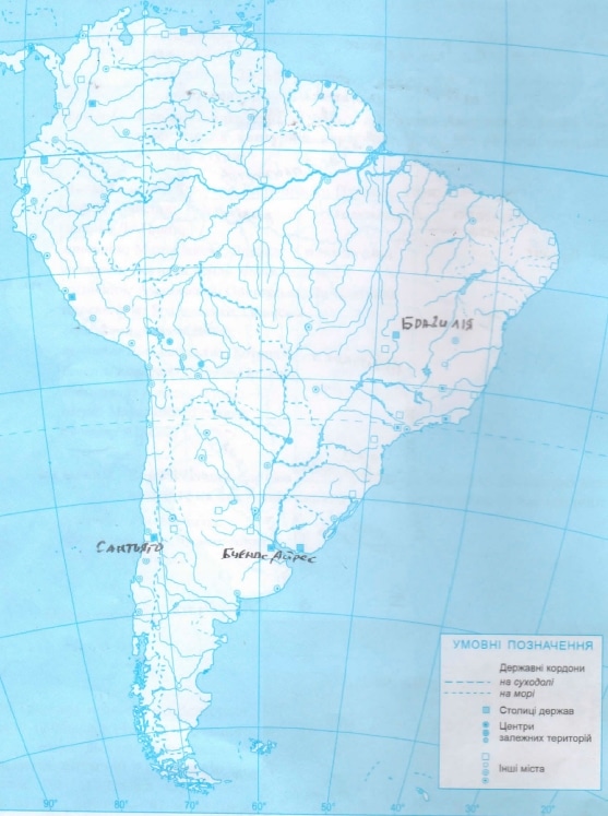 На контурних картах позначили географічні об’єкти Південної Америки, а також три держави із їхніми столицями.