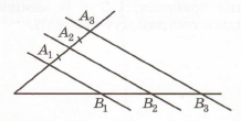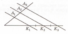 За умовою K2K3 – A2A3 = 5 см, K1K2 = K2K3. За теоремою Фалеса A1A2 = A2A3, звідси K2K3 – A2A3 = K1K2 – A1A2 = 5 см.
